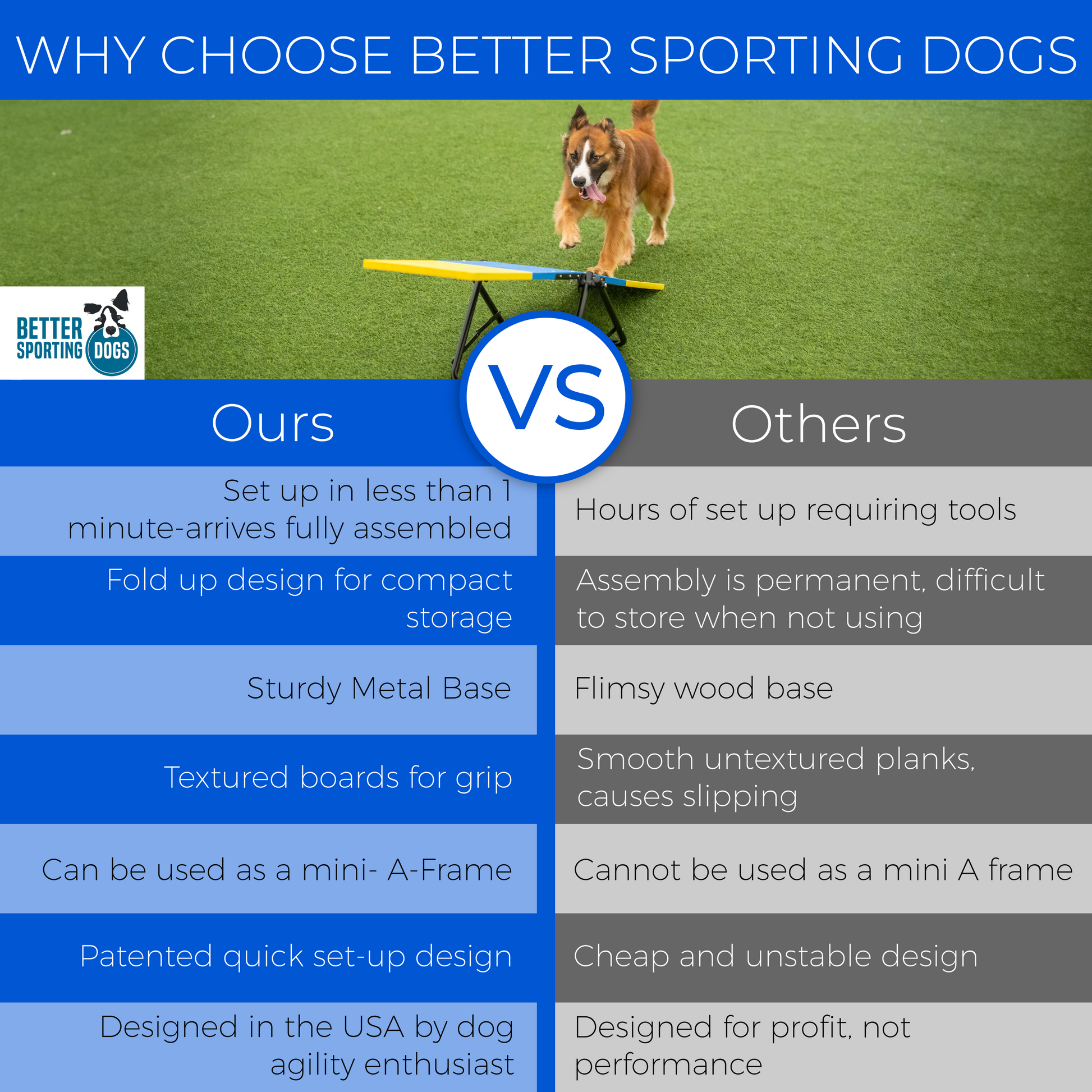 The Retrieverworx Better Sporting Dogs practice seesaw is a great addition to your agility course. The seesaw (or teeter) can be one of the most challenging obstacles. Having an affordable seesaw to practice with at home can greatly improve your dog’s confidence with this obstacle. The seesaw is designed to be used indoors or outdoors, so you can train in any type of weather. The size of the seesaw makes it easy to see up indoors, and it is light enough to make it very easy to transport. It is designed to be foldable – simply take it out of the packaging and unfold it, then lock it in to place and begin training. Altogether, assembly should be complete in under 5 minutes with no tools. An instruction manual is provided. It is suitable for experienced or beginner agility trainers.