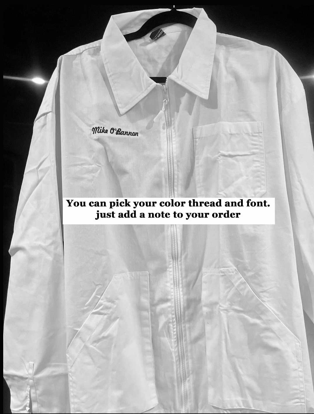 Bold type on pocket. Black thread on white and camo jackets. Tan thread on black jacket.